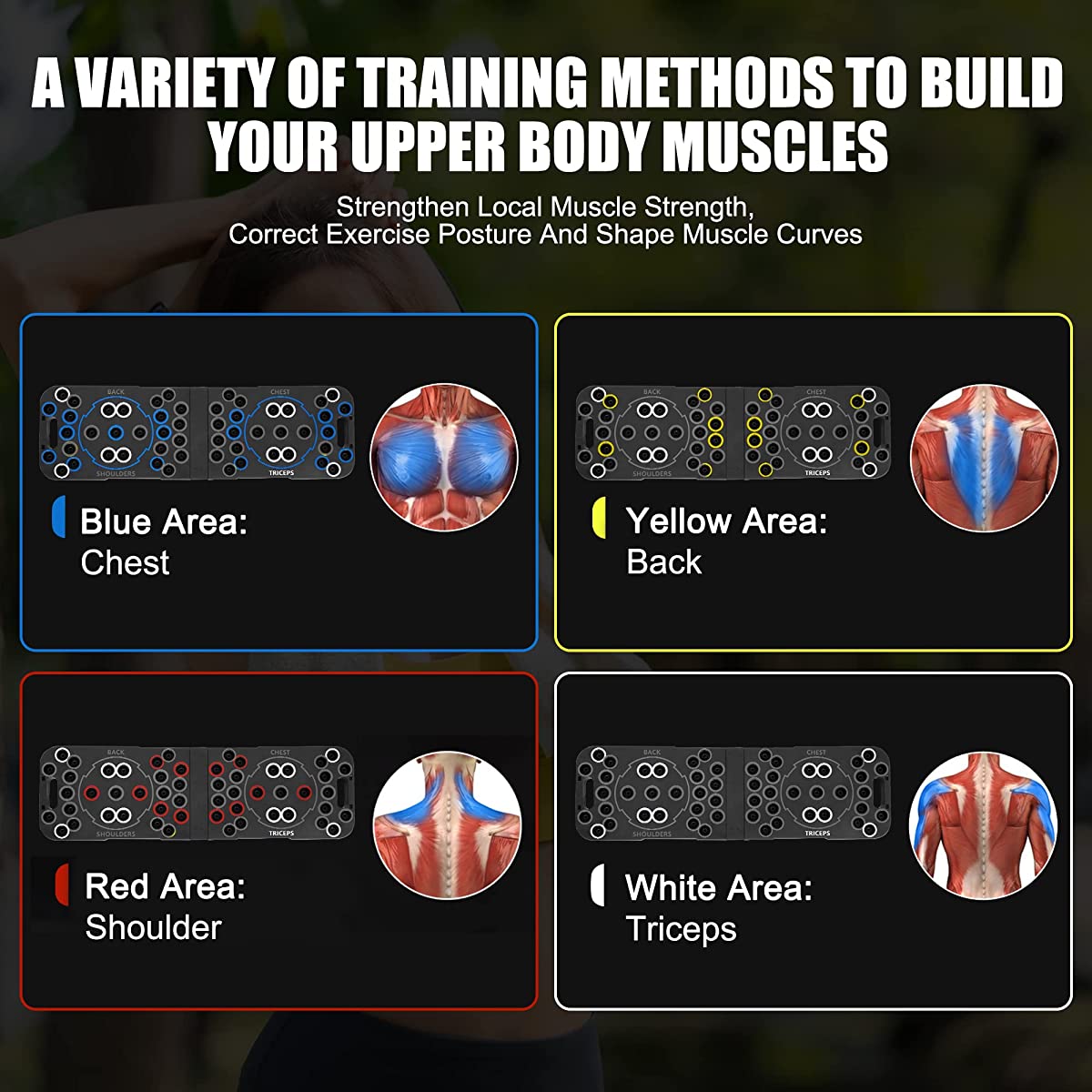 The push up board is color-coded for multiple highly effective pushup postures, optimizing your push up technique and reducing errors. It's scientifically proven to activate 30% to 50% more muscles, and detailed instructions are provided with professional training guidance for developing your major and minor muscle groups.