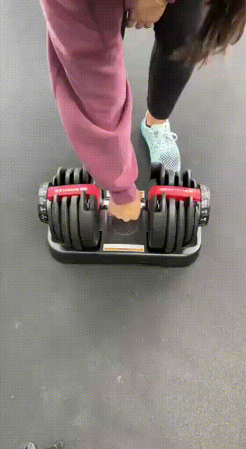 Simply slide the weight adjustment dials located on the outer sides of the dumbbell to your desired weight. The remaining weights will remain in the storage tray on the base. It's that easy!